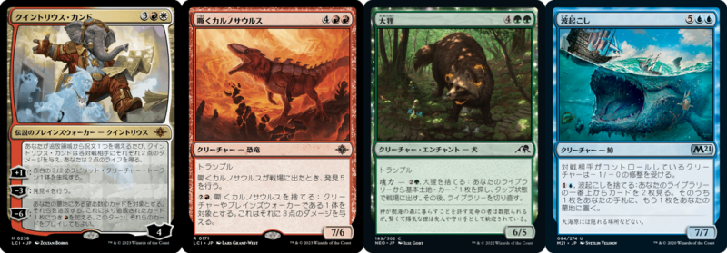 《クイントリウス・カンド/Quintorius Kand》か《嘶くカルノサウルス/Trumpeting Carnosaur》から始まるヒトコロスイッチが何故か勝利を運んできてくれます。