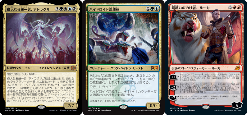 コンボ一辺倒でなくランプして《偉大なる統一者、アトラクサ/Atraxa, Grand Unifier》素だしや《ハイドロイド混成体/Hydroid Krasis》で攻めたり、コンボパーツの《銅纏いののけ者、ルーカ/Lukka, Coppercoat Outcast》の+能力が腐りにくい所。。